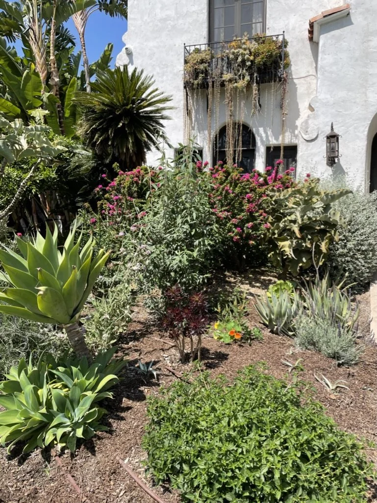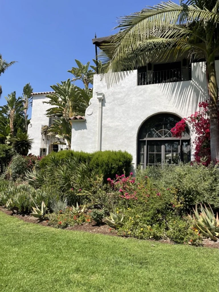 A lush drought-tolerant garden with beautifully colored pollinator plants, designed to complement the home’s Spanish-style architecture while supporting seasonal color.
