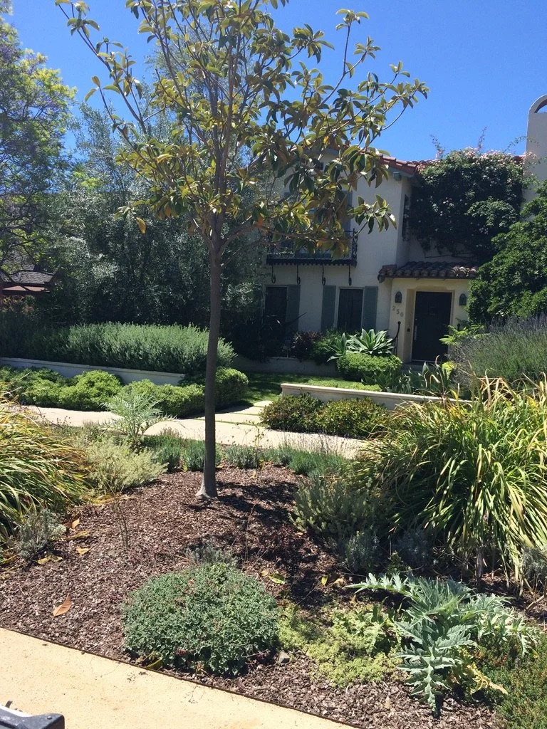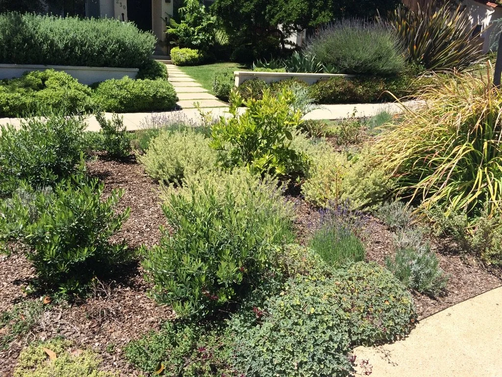 A layered drought-tolerant garden with a few native plants mixed in, along with artichoke plants, designed to support pollinators and year-round growth.